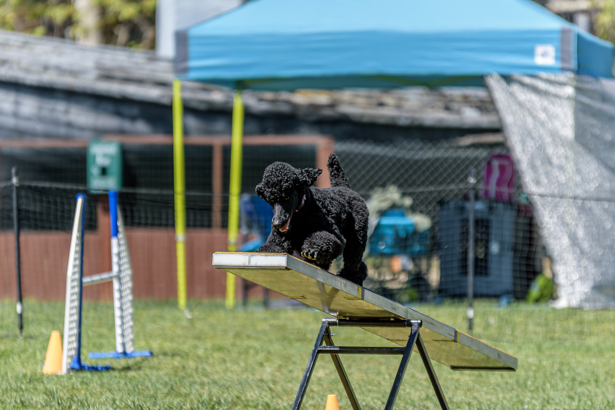 Judy riding the Seesaw down at an outdoor Agility trial.